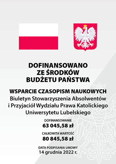 „Biuletyn Stowarzyszenia Absolwentów i Przyjaciół Wydziału Prawa Katolickiego Uniwersytetu Lubelskiego” jest półrocznikiem wydawanym przez Stowarzyszenie Absolwentów i Przyjaciół Wydziału Prawa Katolickiego Uniwersytetu Lubelskiego, poświęconym studiom z zakresu dyscyplin: nauki prawne i prawo kanoniczne dotyczących zarówno aktualnych zjawisk prawnych i społeczno-gospodarczych, jak też ich analizy historyczno-prawnej. Periodyk znajduje się w ministerialnym wykazie czasopism punktowanych (70 pkt). Tylko artykuły oryginalne i spełniające kryterium wysokiego poziomu naukowego mogą być opublikowane w czasopiśmie. Redakcja respektuje zasady etyki publikacyjnej wypracowane przez Komitet Etyki Wydawniczej (Comittee on Publication Ethics – COPE).